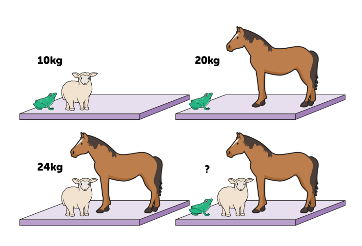 In first three there are 2sheep+2horse+2frog and their weight=10+20+24